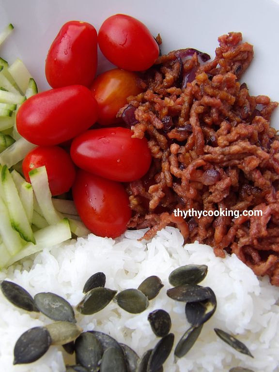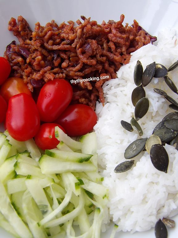 Quay lại tô cơm hôm nay, mình nấu thịt giả, ăn cũng ngon lắm mọi người ạ. Dưa leo, cà chua, vài hạt bí cho hết đề vất cái hộp đi cho đỡ chật chỗ (1 lí do ... Không xơ múi gì với chủ đề ăn uống healthy) tui giờ ngại ăn thịt heo nên ăn nhiều đồ chay hoặc thịt gà gì đấy. Mọi người dùng thịt heo băm xào với hành tỏi cho phần thịt chay của tui là ô kê nhe.