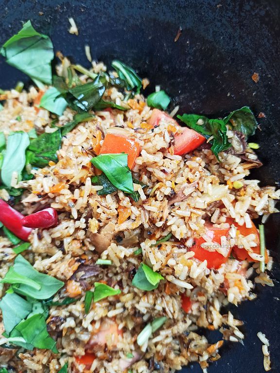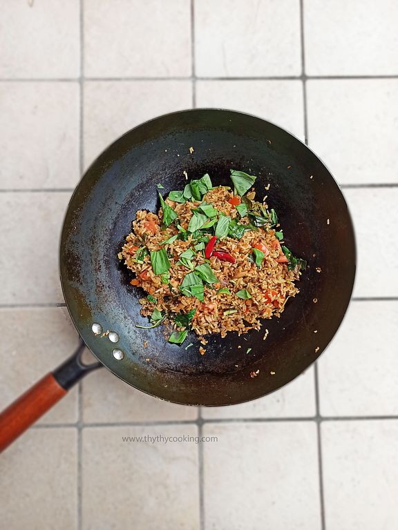 CƠM CHIÊN CÁ THU KIỂU THÁI CÙNG CÀ CHUA VÀ LÁ HÚNG QUẾ