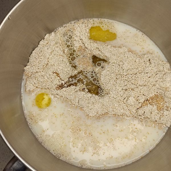 Combina tutti gli ingredienti per l'impasto del pane (ECCETTO IL LIEVITO; aggiungi il lievito alla fine) in una ciotola e mescola. Impasta bene per 10 minuti.