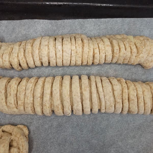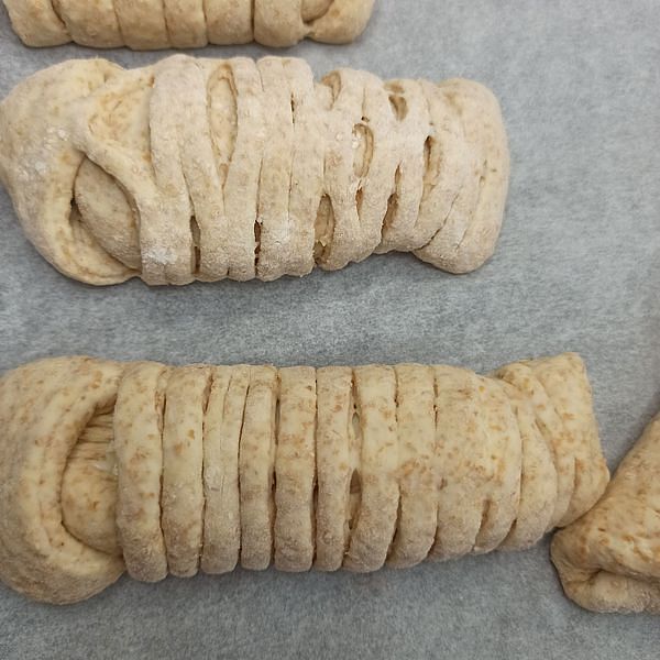 Disponi su una teglia rivestita di carta da forno. Lascia riposare l'impasto fino a quando non cresce di circa il 70%. Cuoci in forno alla temperatura massima. Dopo 7 minuti, riduci la temperatura a 200°C. Cuoci fino a doratura.