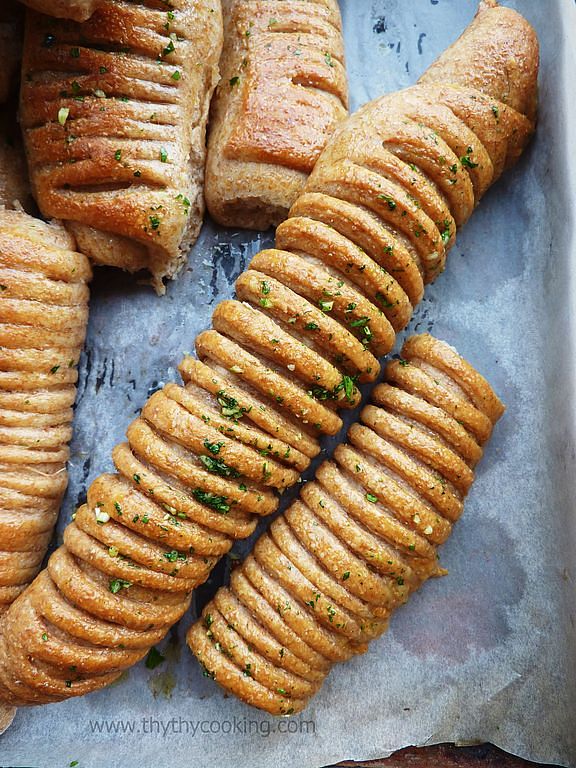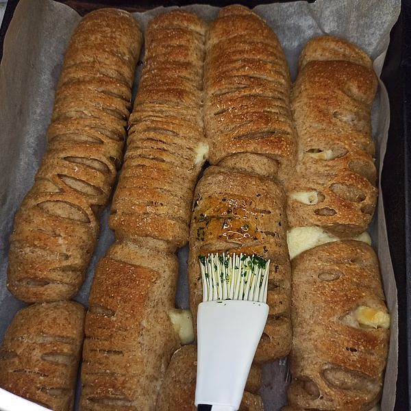 Quando il pane è ancora caldo, spennella il composto di olio e aglio sulla superficie.