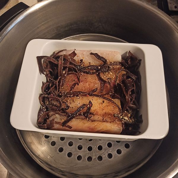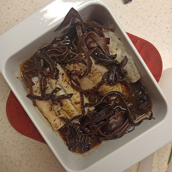 Oggi ho preparato del pesce al vapore con salsa di soia, cipolle, zenzero, peperoncino e funghi orecchio di legno. Avrebbe dovuto includere anche dei vermicelli, ma mi sono finiti, quindi li ho dovuti omettere. 😆
