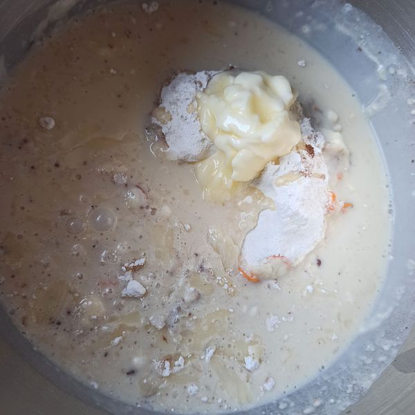 Cho hỗn hợp bánh mì vào thố, nhồi cho đều trong 20 phút.