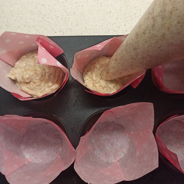 • Cho hỗn hợp vào bịch bắt bông kem. Bóp hỗn hợp vào khuôn muffin.