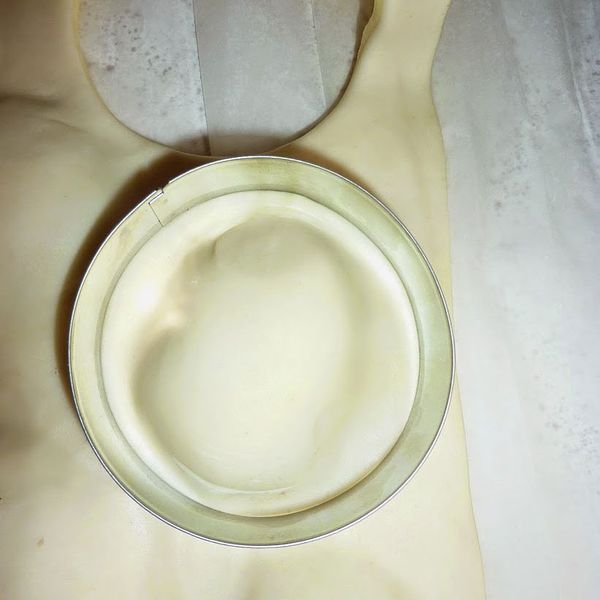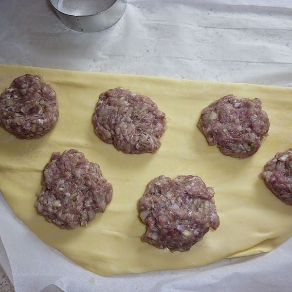 Dùng cái vòng tròn (hoặc ly to) cắt từng cục thịt riêng lẽ, sao cho phần cắt cách mép thịt tầm gần 1 cm, lúc này, chúng ta có 1 cái bánh pa tê sô khá thô.