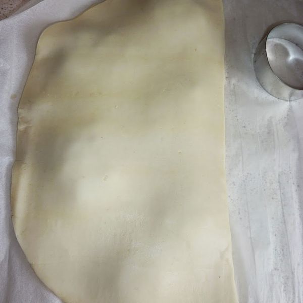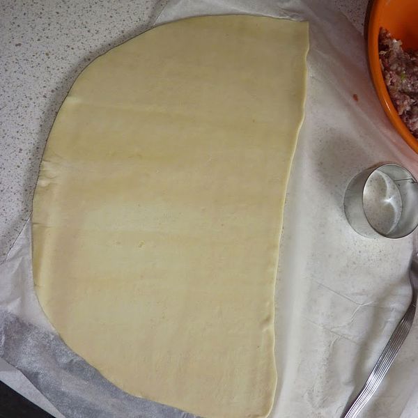 1/2 miếng puff để nguyên (dùng làm đáy bánh), 1/2 còn lại (dùng làm mặt bánh) dùng cái đồ cán (ai ko có đồ cán bột, xài chai bia, chai nước bằng thủy tinh cán vẫn ngon tay vô cùng!), cán nhẹ nhàng bột sao cho miếng bột này hơi to hơn 1/2 phân puff kia 1 tý xíu (tầm 1-2 cm mép bột kia là được.