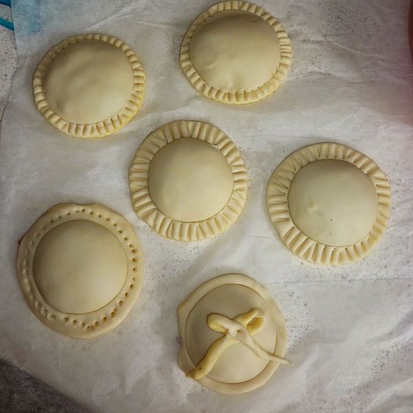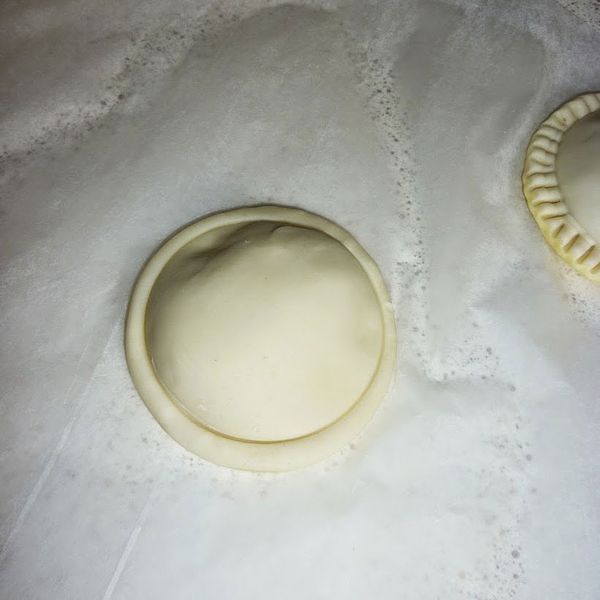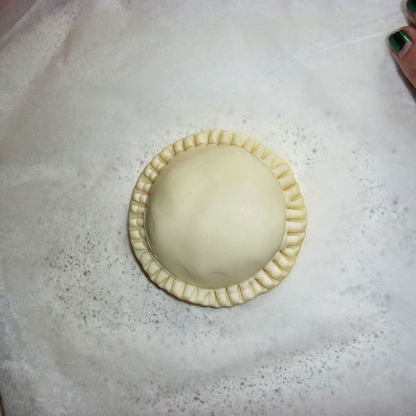 Dùng cái nĩa ấn nhẹ xung quanh phần vành hoặc xắn mũi nĩa xung quanh phần vành để tạo hình bánh pate sô. ;D