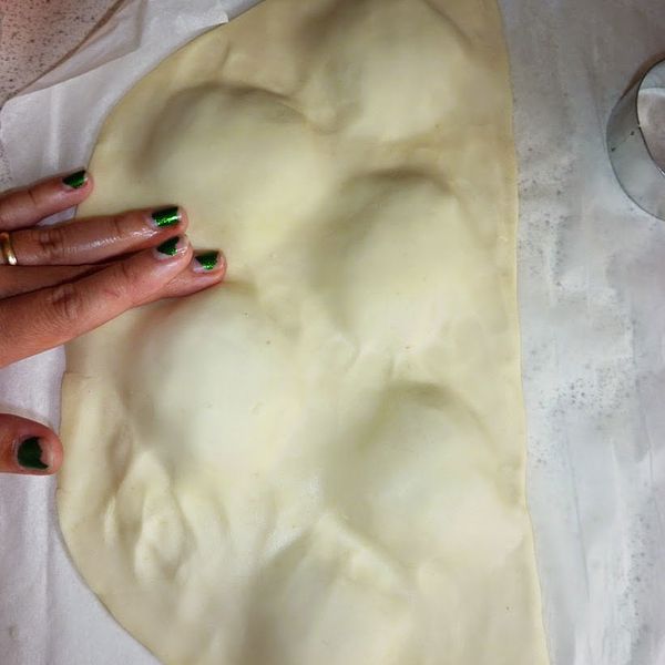 Trải miếng puff còn nguyên ko cán (đáy bánh) lên bàn, đặt phần nhân cách nhau sao cho có thể cắt bánh dễ dàng