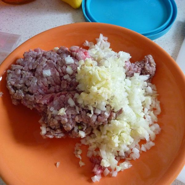 tầm 5 tablespoon thịt bò băm, cũng ko dùng thịt quá nạc.