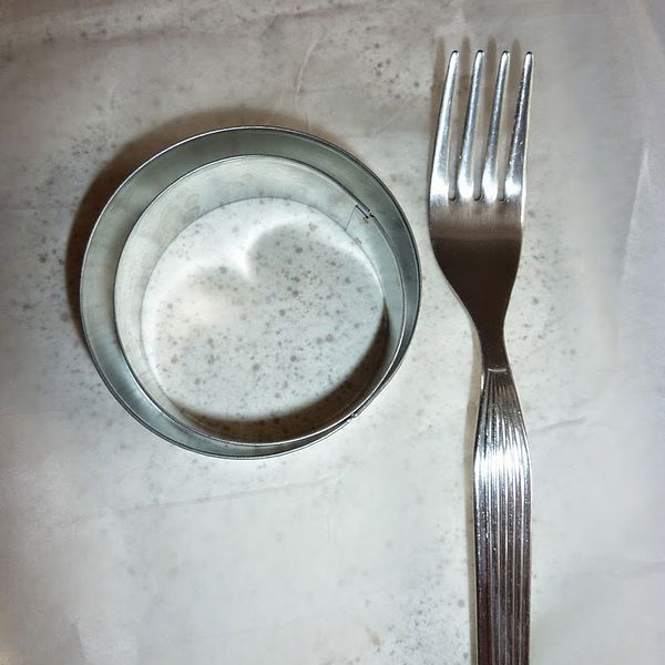 Sau khi thịt đã thấm, chuẩn bị dụng cụ tạo hình, mình dùng 2 cái vòng tròn 1 cái to, 1 cái nhỏ hơn 1 xí và 1 cái nĩa. Tại đây, mình có 2 vòng tròn pasta cutters sẵn. Ai ko có, cứ việc dùng 2 cái ly có kích cỡ khác nhau là được, thành phẩm vẫn ra y chang! ;D