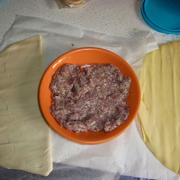 Nhân bánh pate chaud chủ yếu làm từ thịt heo và thịt bò cùng rất nhiều hành tây nên thơm thật là thơm. Có người xào thịt (nhân) trước rồi mới cho vào lớp bánh. Có người lại tạo hình 1 trái banh dẹp (kiểu hambergur) rồi bọc bột lại. Theo cá nhân mình, nếu mà xào thịt trước thì sẽ ra bánh như bánh của tiệm Đức Phát hoặc đại đa số các tiệm bánh tại Sài Gòn (mình chưa bao h ăn bánh tại Hà nội hay các vùng miền khác nên ko nói dc gì!). Riêng nếu tạo hình thịt thành trái banh, ko nấu trước, thì nhân bánh sau khi nướng vẫn còn rất juicy, tươi, gia vị đều, mịn chứ ko hơi khô như đã xào sẵn. Do đó, ai thích cách nào thì làm cách nấy nhe. ;D Hôm nay mình giới thiệu công thức rất ngon và làm bằng cách cho thịt tươi vào nhân thay vì đã xào sẵn ;)