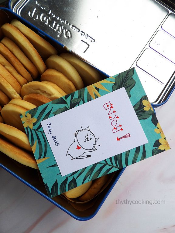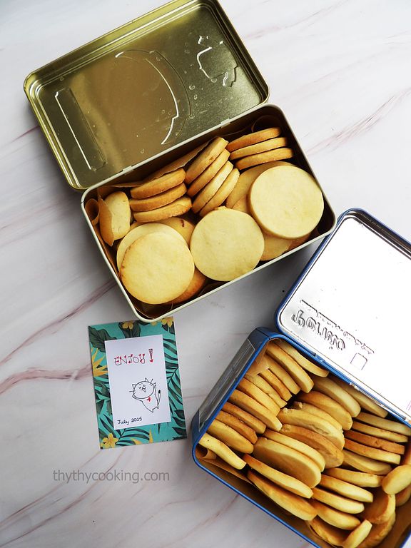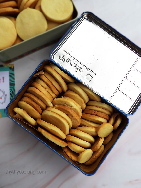 Quay lại bánh quy, mình cho mớ bánh vào hộp thiếc để ăn dần, tiện ghê!