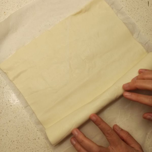 Cho táo lên vỏ bánh. cuộn vỏ bánh lại như hình, nhấn chặt mép bánh để bánh không bị bung ra khi nướng.