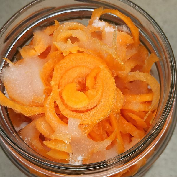 Carote e ravanello daikon tagliati a strisce (Ho usato solo carote poiché non avevo daikon. Ho usato una macchina per tagliare le carote, quindi sembrano un po' ondulate. Oops, la mia pigrizia ha reso questo piatto vietnamita meno tradizionale!)