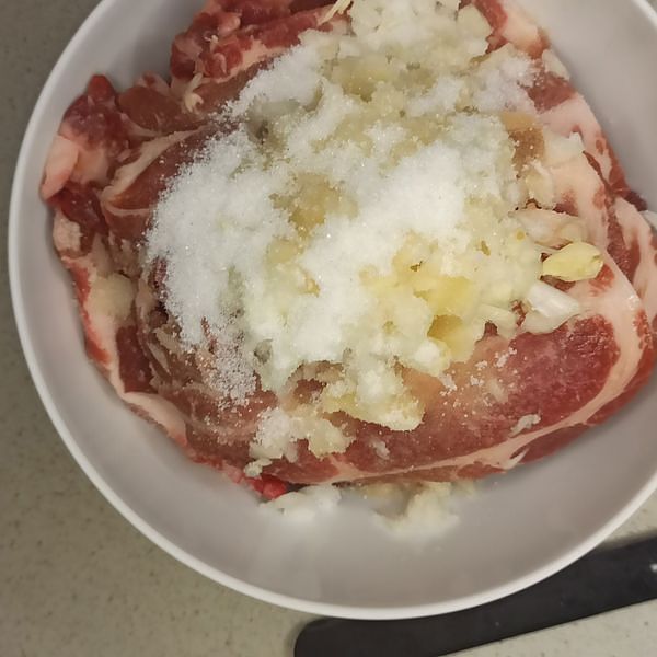 Circa 500g di spalla di maiale, con grasso per un miglior sapore (questo piatto non è per chi è a dieta!). Taglia la carne a fette sottili, circa 5mm di spessore.