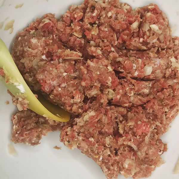 Ướp thịt với 1/2 hành băm và tỏi băm, cùng muối, tiêu, đường, nước mắm và bột năng. Đậy lại, để tầm 1 tiếng trong tủ lạnh.