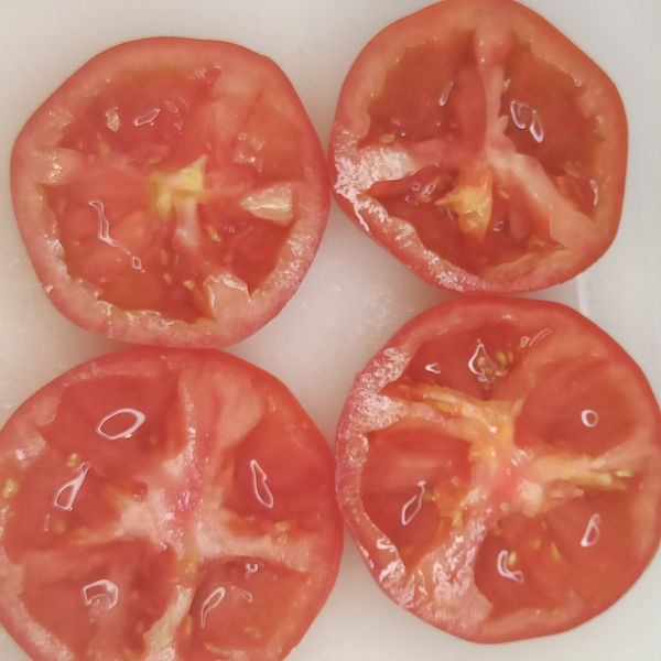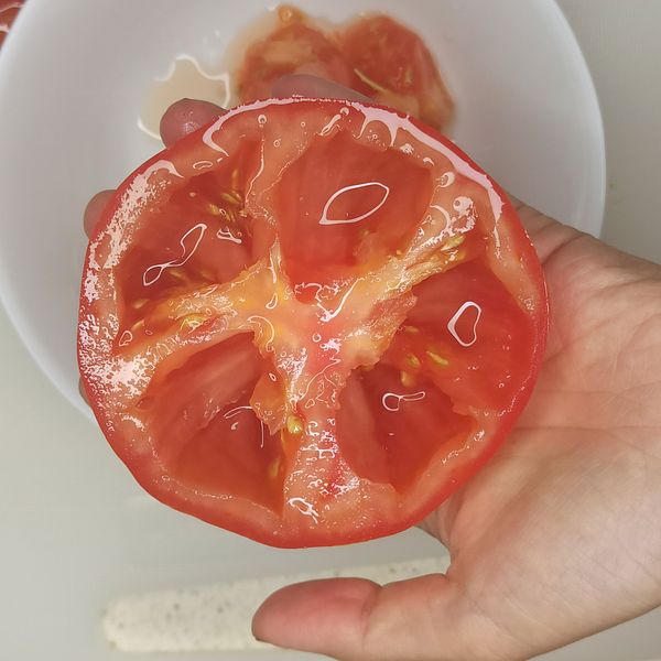 Cắt cà chua ra làm đôi, dùng muỗng nạo ruột như video clip