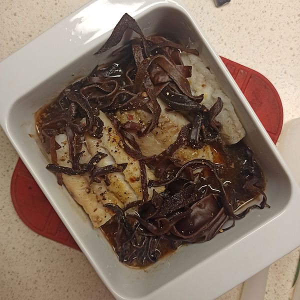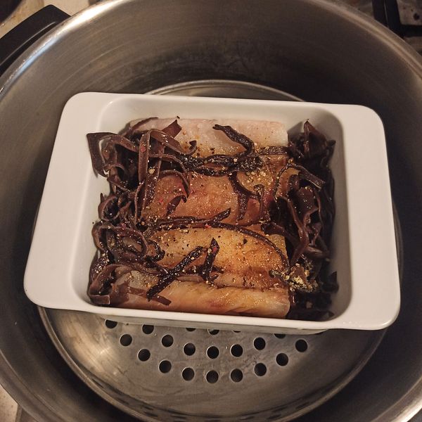 Hôm nay mình nấu món cá hấp tương, hành, gừng, ớt và nấm mèo. Nhẽ ra có cả miến nữa, nhưng nhà hết miến nên thôi, nhịn vậy. 😆