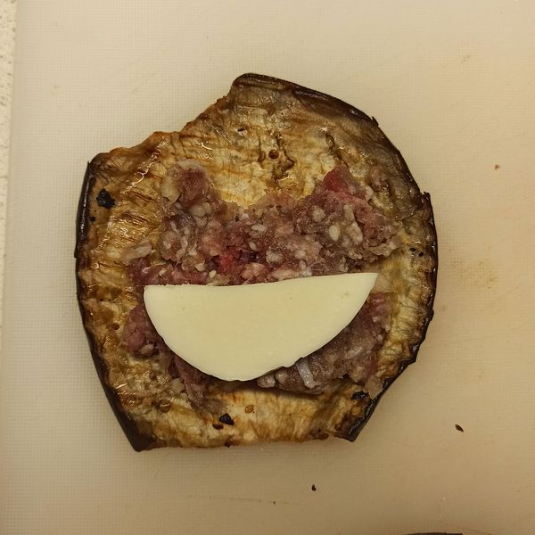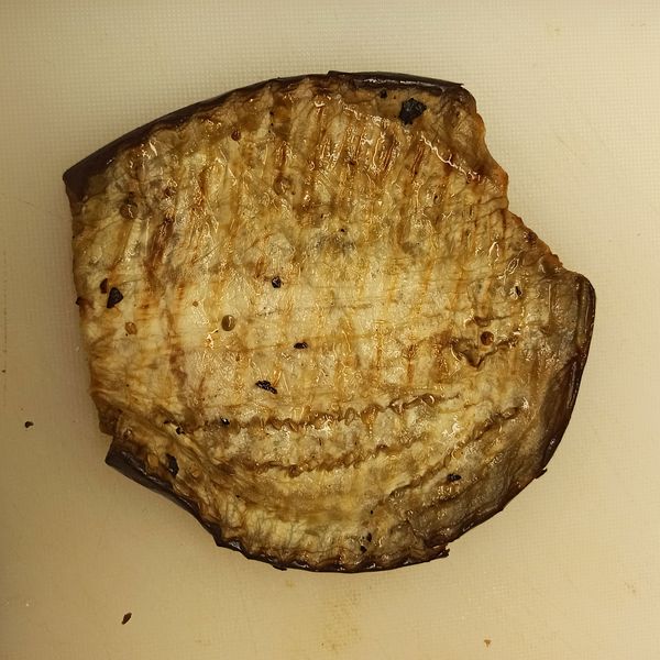Tầm 20 lát cà tím cắt lá mỏng tầm 7 mm. Mang đi nướng trên chảo với xíu dầu ăn cho chín. ai tìm được cà tím nướng đông đá sẵn như mình thì mua dùng cho tiện.