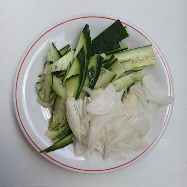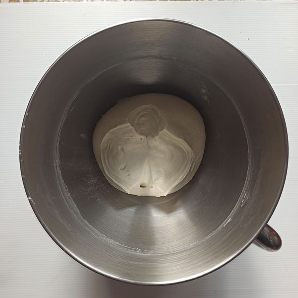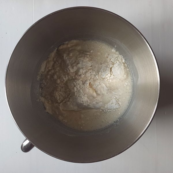 Cho bột, nước, muối, dầu ăn vào thố. Đánh cho quyện lại trong 5 phút