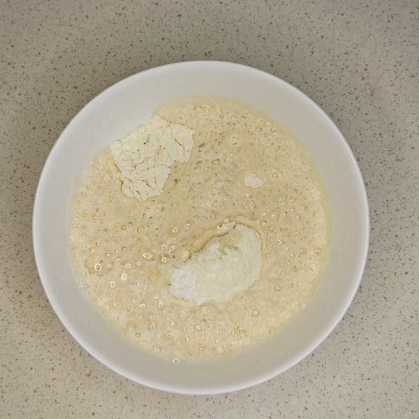 Cho bia lạnh vào bột mì, cho baking powder, xíu muối. Dùng cái đồ đánh trứng (whisk) đánh cho đều.