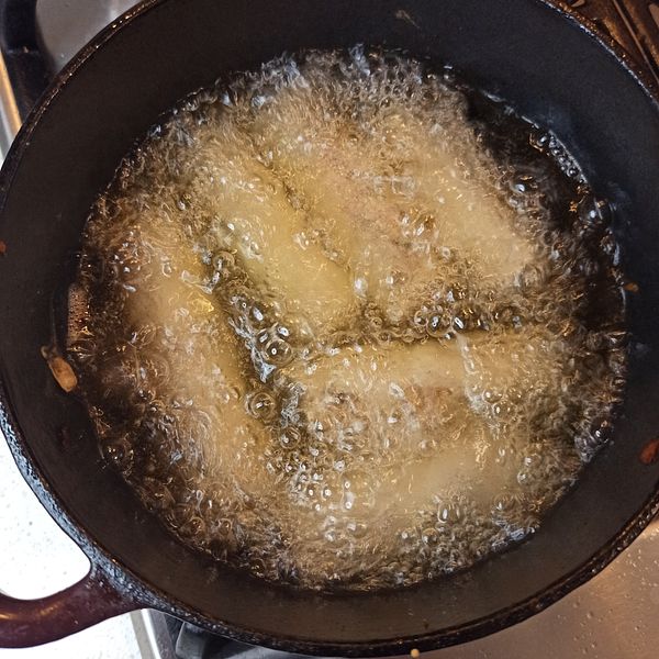 Chuẩn bị chảo dầu, mình dùng nồi gang cast iron, giữ nóng siêu tốt, cực thích hợp cho chiên deep fry.