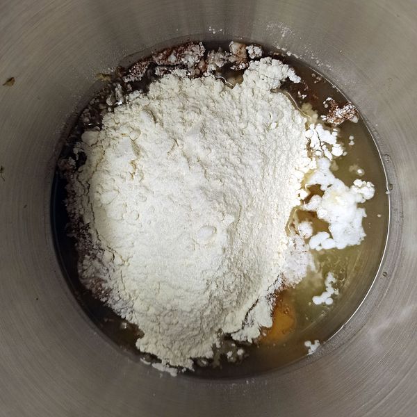 In a large bowl or the bowl of a stand mixer, beat together the oil, sugar, salt, eggs, spices, baking powder (seived well), and baking soda.