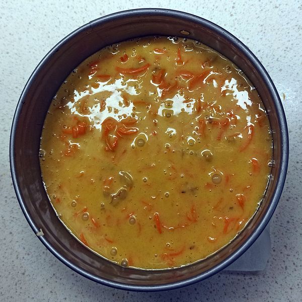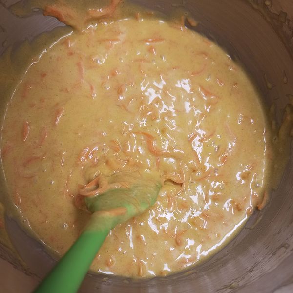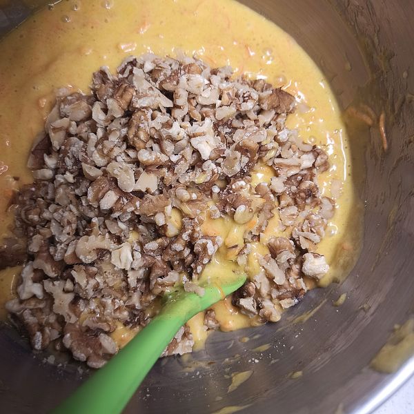 Add the carrots and nuts, and mix until just blended. Pour into the prepared pan(s).