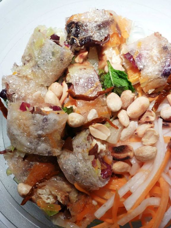 Chả giò của mình nhân bo gồm: bắp cải, carot, nấm mèo sắt sợi mỏng; đậu đỏ to (kidney beans) luộc chín, đậu hũ chiên cắt thanh dài. Chiên lên vỏ thì giòn, bên trong bùi bùi của đậu đỏ, nhưng thanh nhẹ từ rau củ, rất rất là ngon! nước mắm chay nhẹ nhàng, chua ngọt vừa phải cùng bún và rau xà lách, rau thơm, rau húng, ngon ơi là ngon. ;)