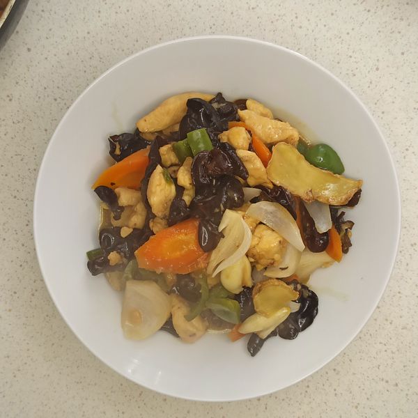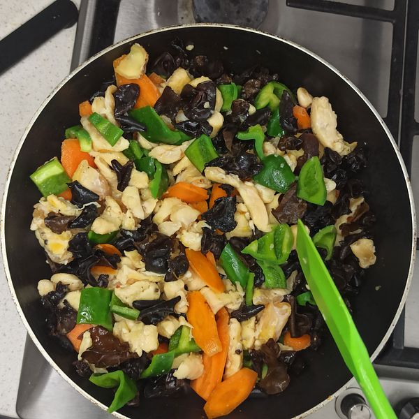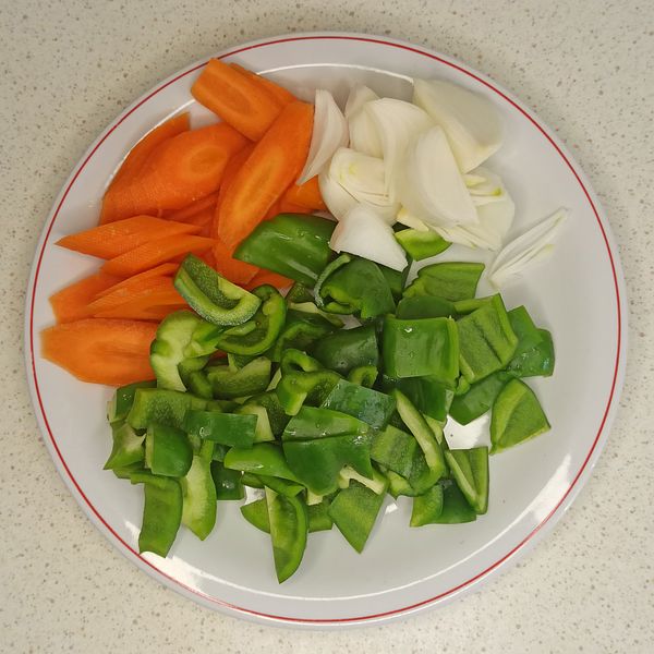 Heat a pan over medium heat, add cooking oil, and let it heat up. Add the chicken and cook until it becomes firm and slightly golden, without fully cooking it. Add minced garlic and sliced ginger for fragrance. Add carrots and bell peppers, and stir-fry until well combined. Pour in a little water and cook over high heat for 5 minutes to quickly cook the vegetables while retaining their vibrant color. (I use a cast-iron pan, which retains heat well and provides a delicious stir-fry result). Season with salt.