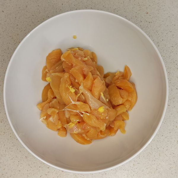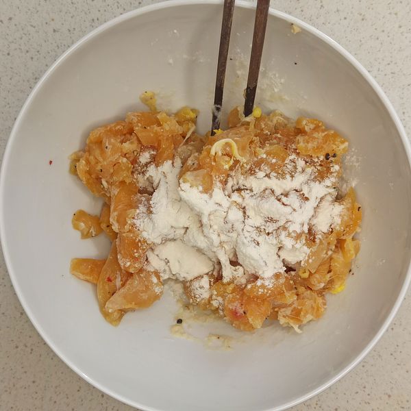 Take out the marinated chicken and coat it evenly with cornstarch.