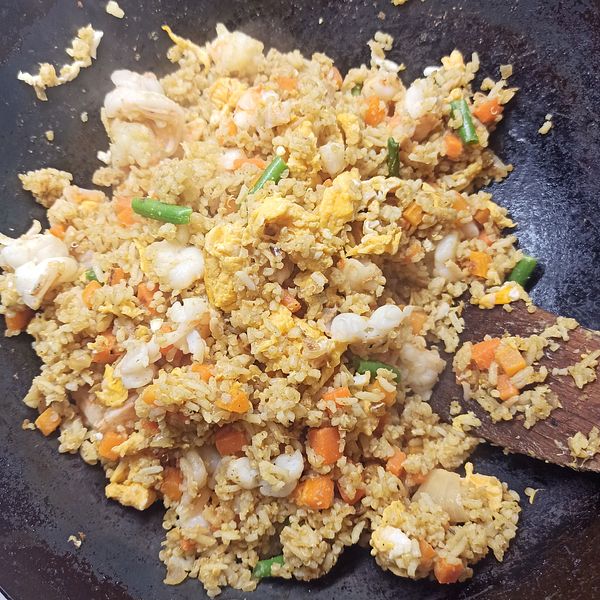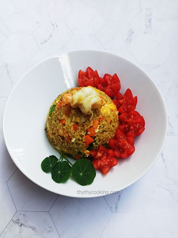 Nhân dịp nhà có 1 bịch tôm đông lạnh nên lôi ra làm món cơm chiên cà ri. Mình ăn món này ở 1 nhà hàng tàu. Chứ thời ở VN, mình chỉ biết 1, 2 loại chơm chiên đơn giản như là cơm chiên Dương châu, cơm chiên cá mặn, cơm chiên hạt sen. Món này mình thấy ăn rất là ngon, lạ miệng. Thật ra thì món cơm chiên nào cũng ngon, nói toạc ra như vậy cho dễ hiểu! hahah! Nhưng vị cà ri thì sẽ không nhầm lẫn với các loại cơm chiên khác. :D Chú thích: mình nấu tôm luộc cho con mèo Nương Nương mà nó nhất định cự tuyệt! Mình lôi nó ra tô cơm, chỉ vô tô mà nó ngửi ngửi xong rồi chạy ra sau lưng mình núp! Là sao đây bà kia! Cái mình cầm miếng tôm lên, đưa ra trước mặt nó, nó nể nang cũng ngoe nguẩy đuôi ngửi ngửi, ngước mắt nhìn mình meo meo xong nó bỏ đi chỗ khác kiểu "Thôi, mamma đừng cố gắng chi nữa" hụ hụ!!! cơm-chiên-tôm-cà-ri-(2).jpg1.26 MB