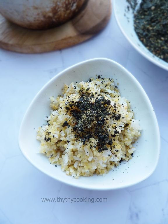 Your homemade healthy Furikake is ready to dazzle your dishes! PS: My rice looks strange, because I cooked sticky rice with bulgur, packed of protein! My little is vegetarian, so I try to provide her alternative protein! It is very yummy too!