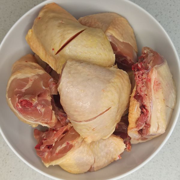 Thịt gà chặt khúc nhỏ vừa ăn. Mình thì không chặt quá nhỏ, nhưng mình khứa 1 đường trên thịt cho thấm gia vị.