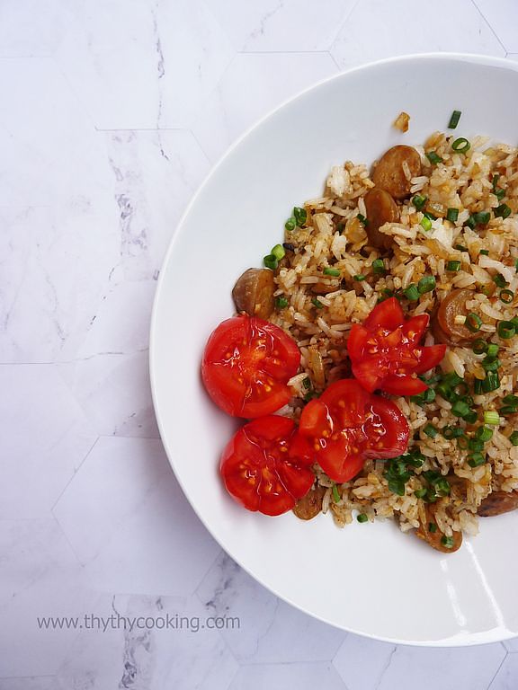 Garlic onion fried rice with Chinese sausage is a flavorful and aromatic dish that elevates simple fried rice into a satisfying meal. The base of the dish consists of fluffy, day-old rice, which is stir-fried to achieve a slightly crispy texture. Aromatic garlic and sweet onions are sautéed until golden, infusing the rice with rich flavors. The addition of Chinese sausage brings a savory and slightly sweet taste, adding depth to the dish. Often finished with a drizzle of soy sauce and garnished with green onions, this fried rice is not only delicious but also colorful. It serves as a perfect side dish or a standalone meal, showcasing the delightful combination of textures and flavors that make fried rice a beloved favorite in many cuisines. garlic onion fried rice with sausage 2.jpg83.4 KB Do you know: