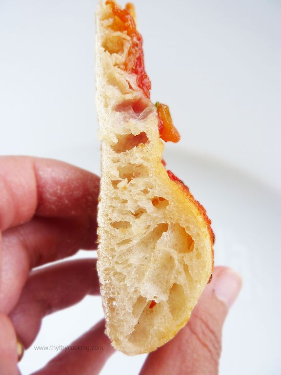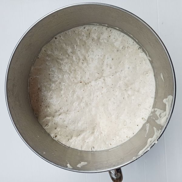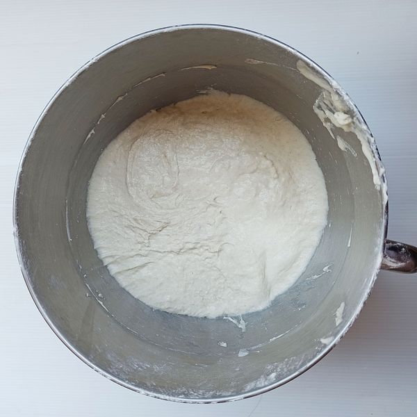 Put all the ingredients for the dough together and mix until well combined. If you don't have a mixer, be prepared as the dough will be quite wet. Knead for about 15-20 minutes.