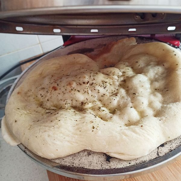 To make Focaccia, simply press the dough ball to a thickness of about 0.5 - 1 cm as desired. Drizzle a generous amount of olive oil over the dough, sprinkle with oregano, and then bake until golden brown.