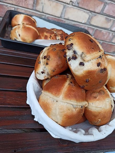 To optimize Hot Cross Buns for Weight Watchers, reduce the sugar and butter amounts to lower calories and fat while keeping sweetness balanced. Replace part of the all-purpose flour with whole wheat flour to increase fiber and improve satiety. Use fewer chocolate chips or swap them with dark chocolate chips that have higher cacao content and less sugar. Soak the raisins in fresh orange juice to add natural sweetness without extra sugar. For the cross, keep the simple flour-water mixture but limit added essences to avoid unnecessary calories. This keeps the buns flavorful yet lighter for healthier indulgence.