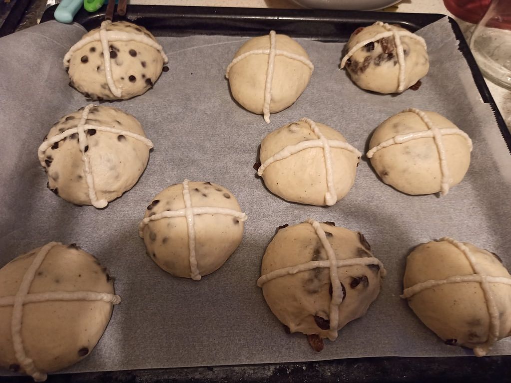 Hot cross buns are sweet, spiced buns traditionally enjoyed during the Easter season. Made with soft, enriched dough, they’re delicately flavored with warm spices like cinnamon and nutmeg, and often studded with raisins or currants for bursts of sweetness. The most iconic feature is the white cross piped on top, symbolizing the holiday’s religious roots. As they bake, the buns turn golden brown and develop a slightly glossy finish, often from a sugar glaze brushed on while still warm. Soft and fluffy inside, they’re comforting to eat and pair well with butter, jam, or even a slice of cheese. Hot cross buns are not only delicious but also carry a sense of tradition and festivity. Whether served for breakfast, tea, or as part of a holiday meal, they bring a gentle sweetness and warm spice that evoke the coziness of springtime celebrations.