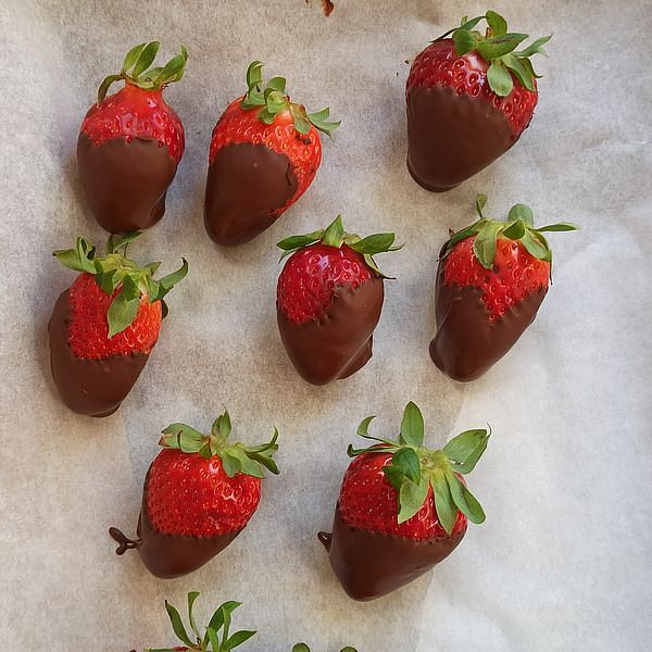 Dip fresh strawberries into the dark chocolate, then place them on a tray lined with baking paper.