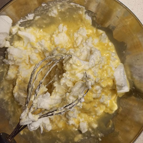 In a separate bowl or the bowl of your stand mixer, use clean beaters or the whisk attachment to combine the egg whites and cream of tartar or 1/2 teaspoon lemon juice. Whip until very stiff.
