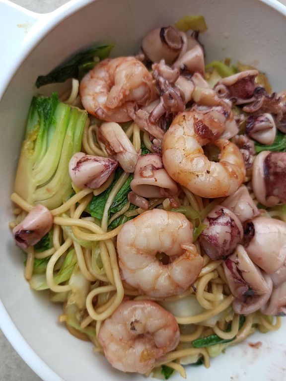 Xào thêm vài tép tỏi, cho tôm và hải sản vô, nêm muối, nhanh tay xào cho săn lại. Đổ hải sản lên mì.