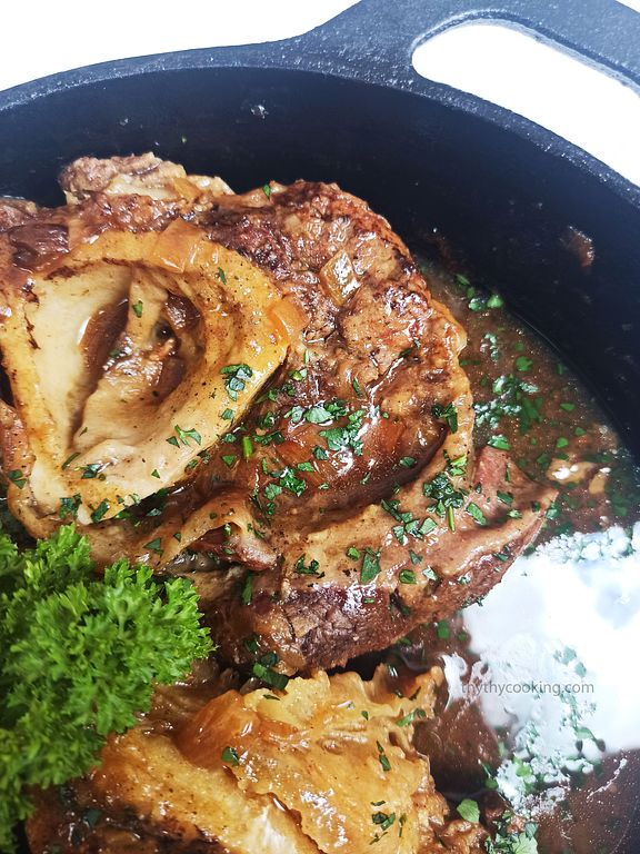 2. Heat a skillet over medium heat and add butte 3. Place the ossobuco slices in the skillet and brown each side for about 5 minutes. 4. Add chopped onions and sauté until fragrant.