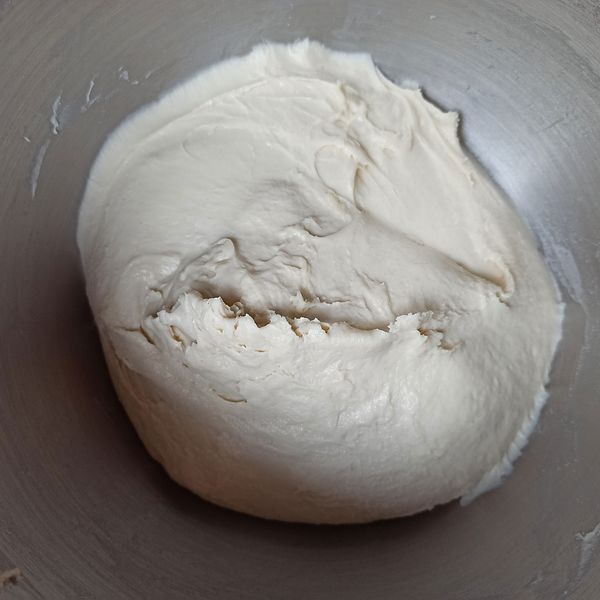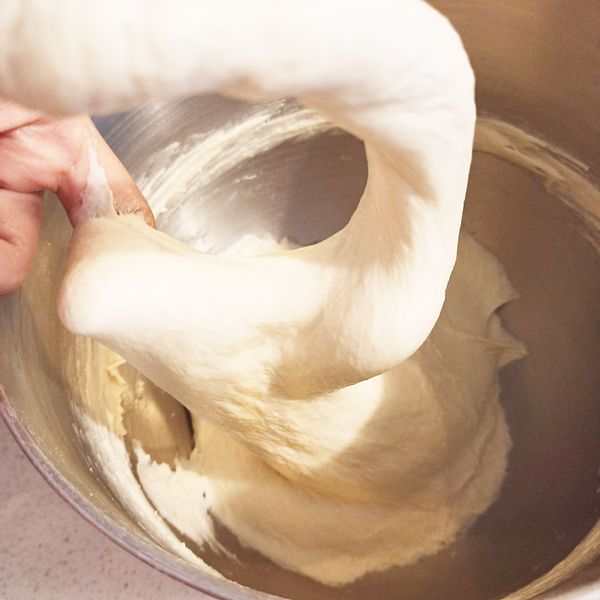 Mix flour, fresh milk, sugar, butter, and yeast together. Then gradually add water.