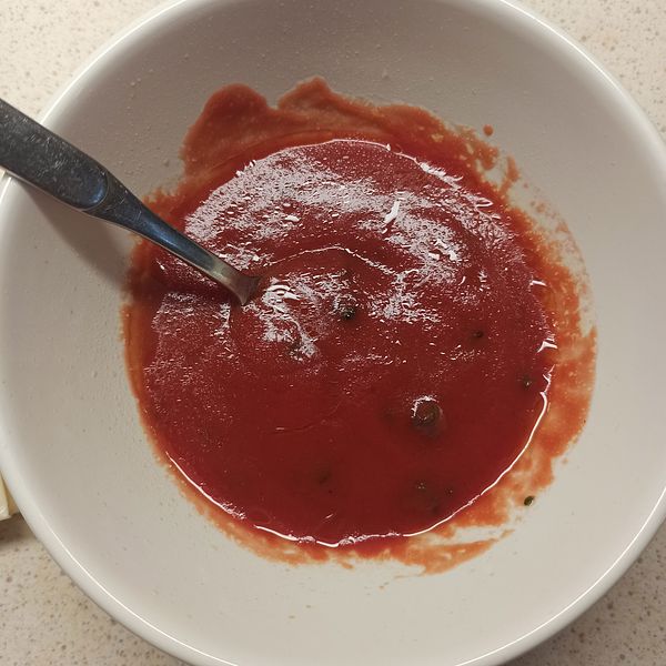 Chuẩn bị sốt cà chua: sốt cà chua + muối + dầu ăn + origano + (xíu đường nếu thích, vì sốt cà chua thường hơi quá chua)
