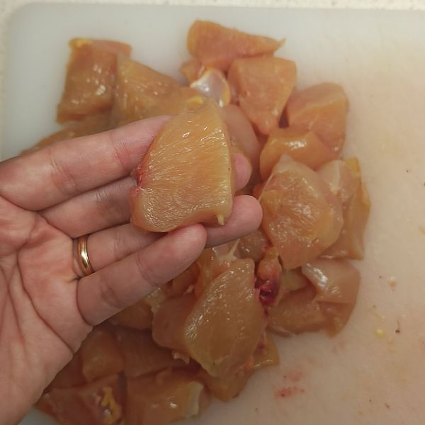 Petto di pollo, tagliato a pezzi della dimensione giusta per essere infilzati su spiedini.