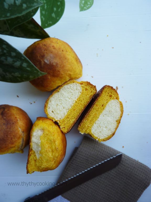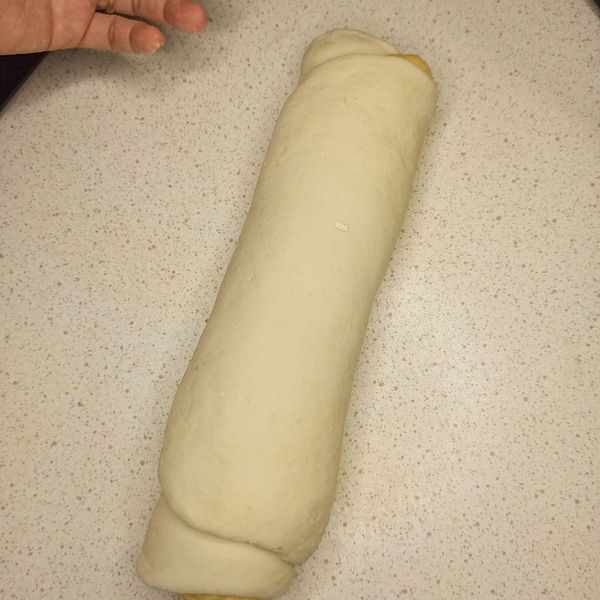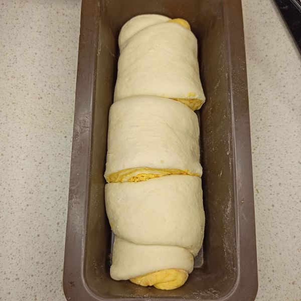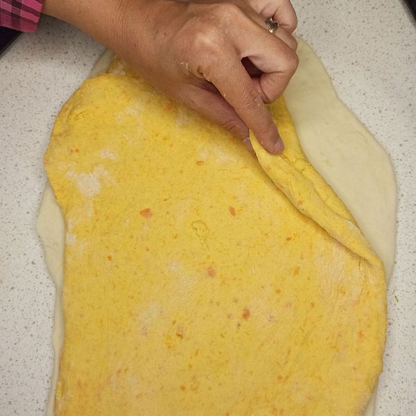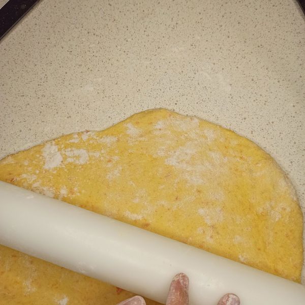Shape the bread into round swirly pillow rolls: Roll out the white and orange dough to a thickness of about 5mm. Place the orange dough on top of the white dough. Roll it up.