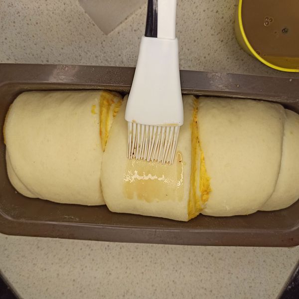 For a beautiful and glossy appearance, you can spread a layer of plum jam on the surface of the bread. However, in this case, you are not doing it as the swirl pattern of the orange and white dough already looks excellent. Haha!