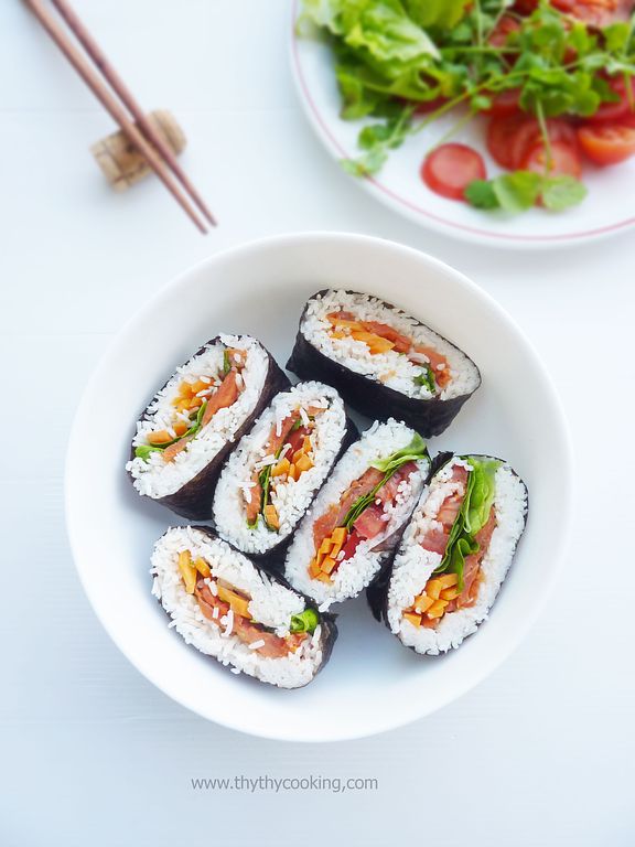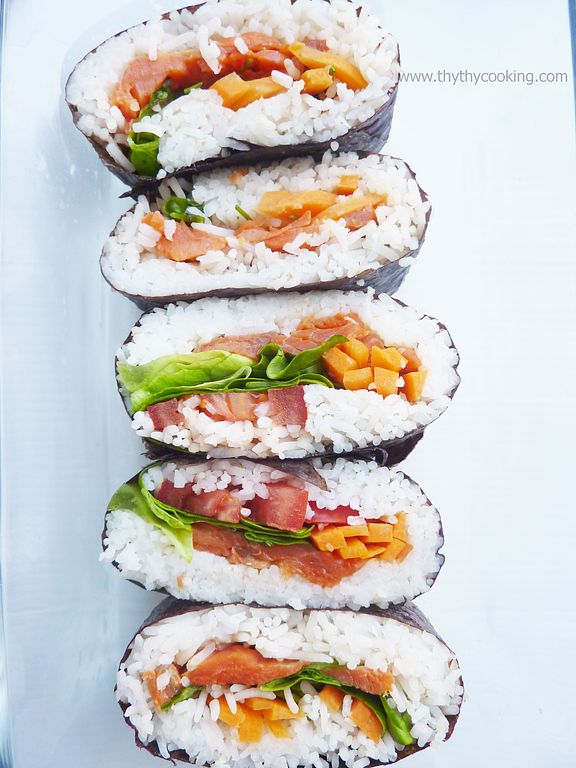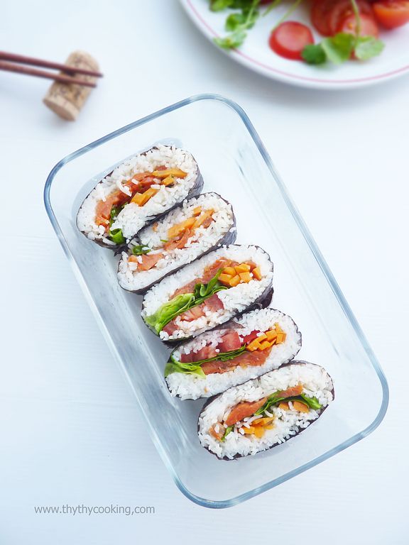This rice dish resembles sushi, but it's more like a sandwich. It's convenient for kids to take to school, but usually, I don't include fish in it because it can have a strong odor, and it's not guaranteed to stay fresh for a long time, especially in hot weather at school. This rice dish is just a "copycat" version, not the authentic Japanese Onigirazu, as I don't use Japanese rice. My Japanese friend often makes beautiful bento boxes and sushi. She says she isn't very "Japanese," but her food still turns out great. My daughter often tells me about the bento boxes of D, her daughter. Asia, my kid, often goes to their house for lunch, and she told me D's grandparents make some kind of special sprinkles that goes really well with rice. she even claims it's the best rice dish she's ever had in her life! Oh my goodness! I was born in a rice country, and if she says that, it breaks my heart! 😿 I asked for the secret recipe from D's mom, who told me that her parents grow a type of leaf similar to shiso and dry it, then grind it with salt... I've tried planting shiso from seeds, but for 16 years, it has never sprouted. 😞 I guess I'll have to ask Asia to go to D's house and have lunch there instead! Hahahah! 😆 Sushi sandwich - com cuon sandwich - sushi panino (3).jpg1.04 MB