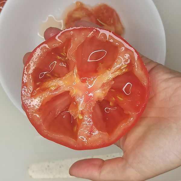 Cut the tomatoes in half and use a spoon to scoop out the pulp, as shown in the video clip.